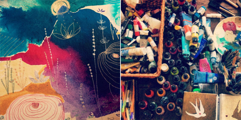Shown above: an up close shot of one of my paintings done on handmade paper along with a plethora (just a snippet actually!) of my art supplies. Lately I have been pondering why painting has been of such value in my life. We have had such a deep and intimate relationship, second to that of …