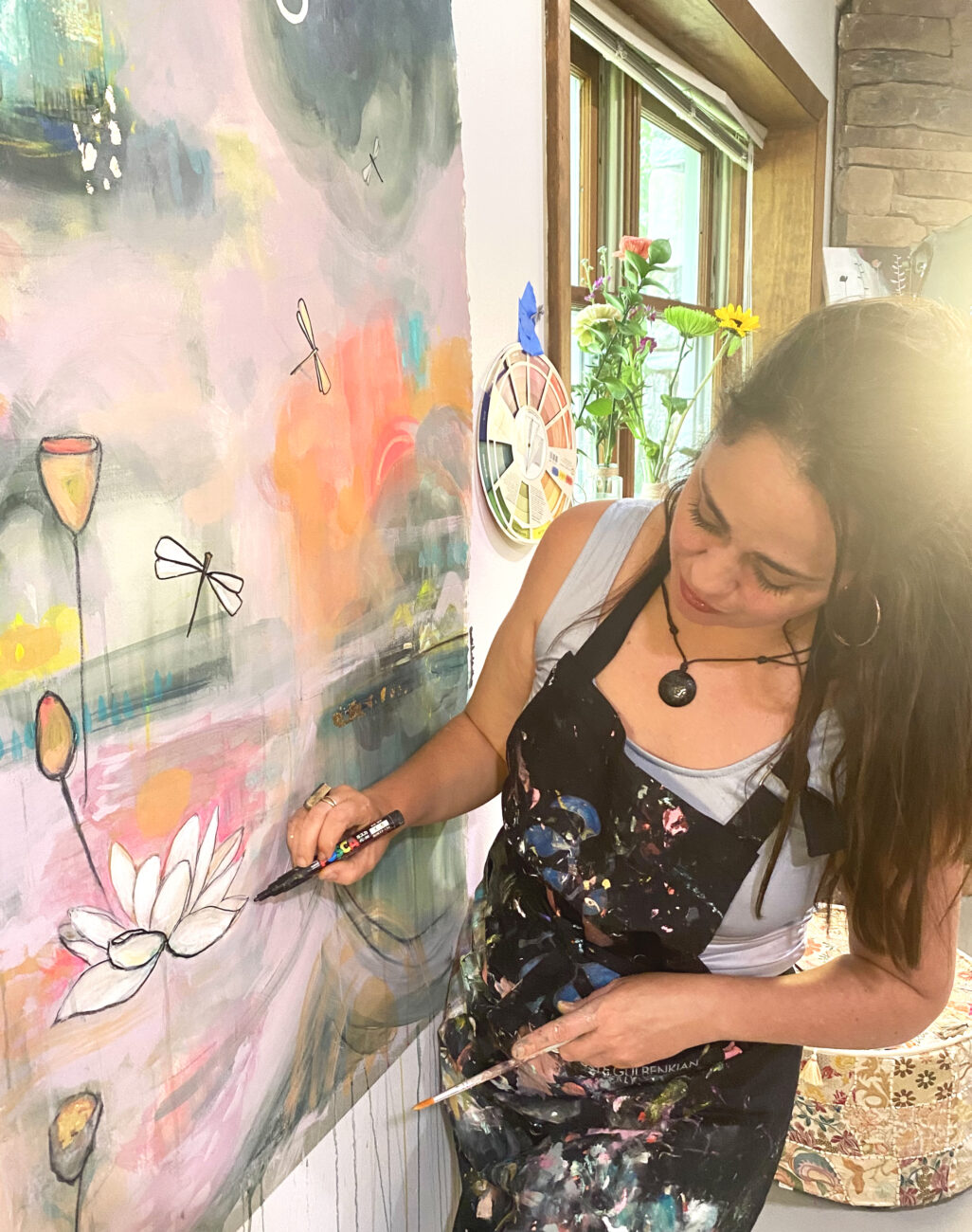 I have been teaching art for over 17 years, with thousands of students participants enrolled in my online classes. I lead retreats and workshops both at my studio and around the world. I also have 4 books out on painting, the creative process, and flower essences and have exhibited in galleries and a few museums. Ultimately, my sincere interest also lies in connecting to Nature, Spirit, and our shared humanity. Being a Reiki Master, Flower Essence Practitioner, and space holder for women infuses into every aspect of my work.